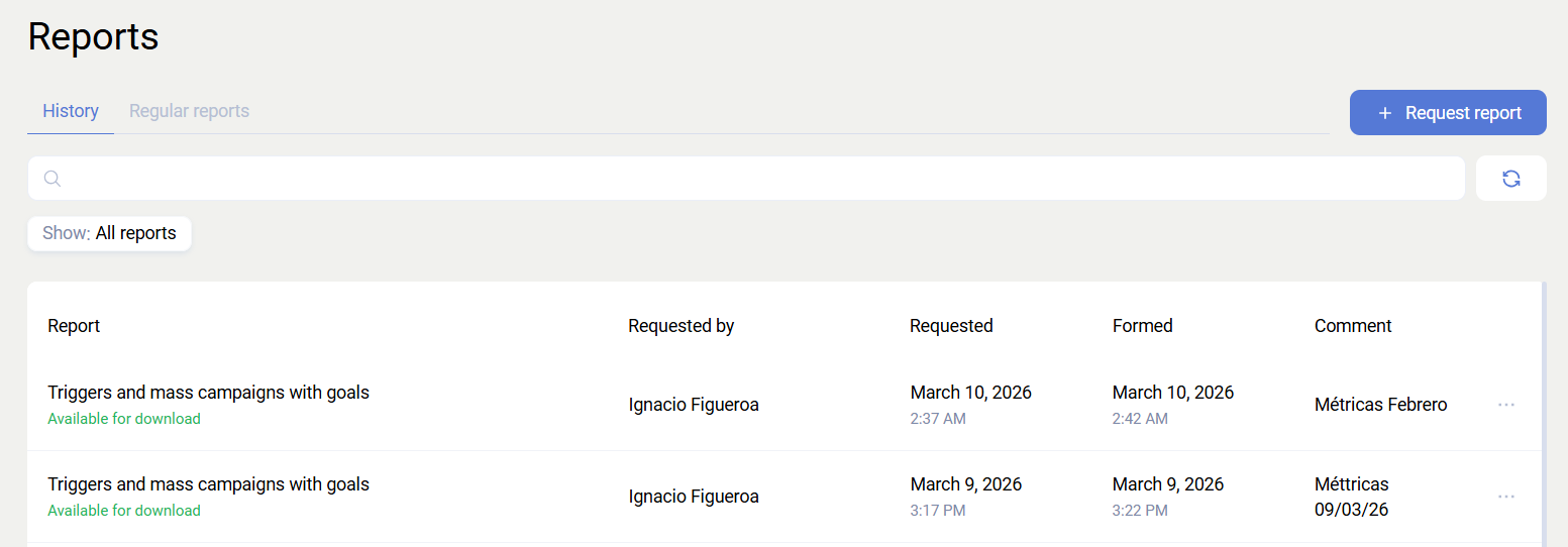 - Triggers and Mailings - includes analytics for the Email, SMS, and Push communication channels. If a purchase is set as the goal in the trigger or mailing settings, the report will show how many times that goal was achieved.