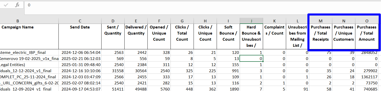 You can view the results, including the total purchase amount attributed to a mailing, in the Triggers and Mailings report. If an attribution model is configured for a mailing, separate columns will display the number of orders, unique clients, and total purchase amount.