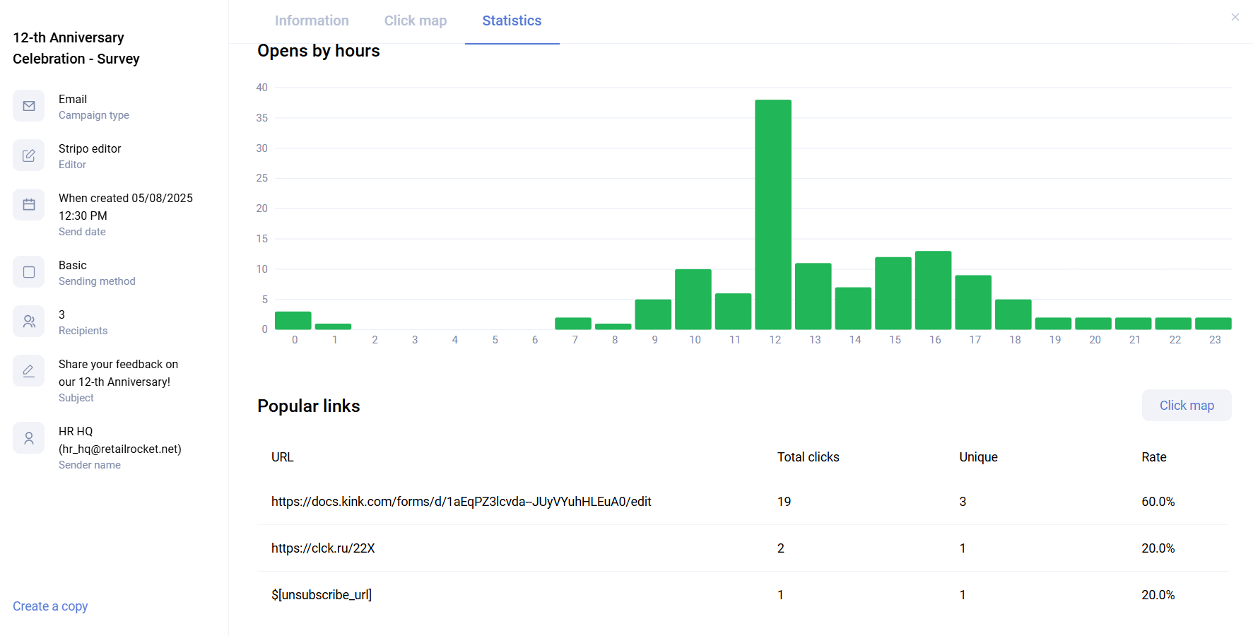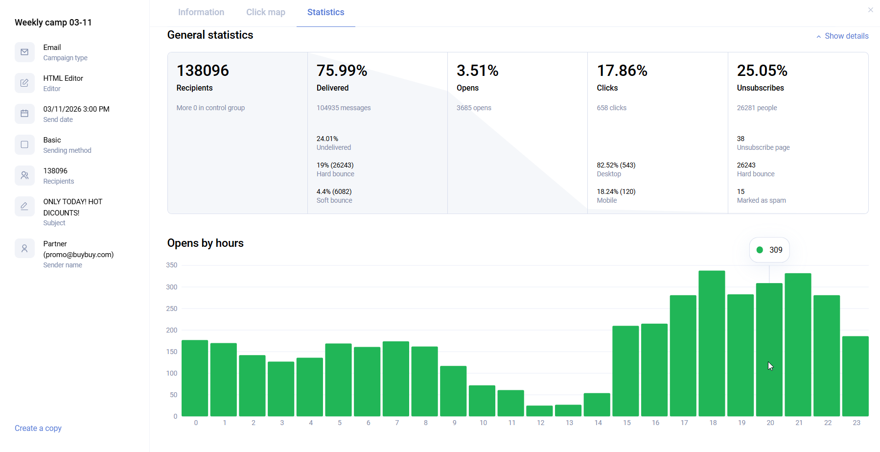 Email opens by hour. This chart shows how many opens happen at each hour of the day, regardless of whether the mailing was sent one day ago or ten days ago. It continues updating as long as clients keep opening the mailing.