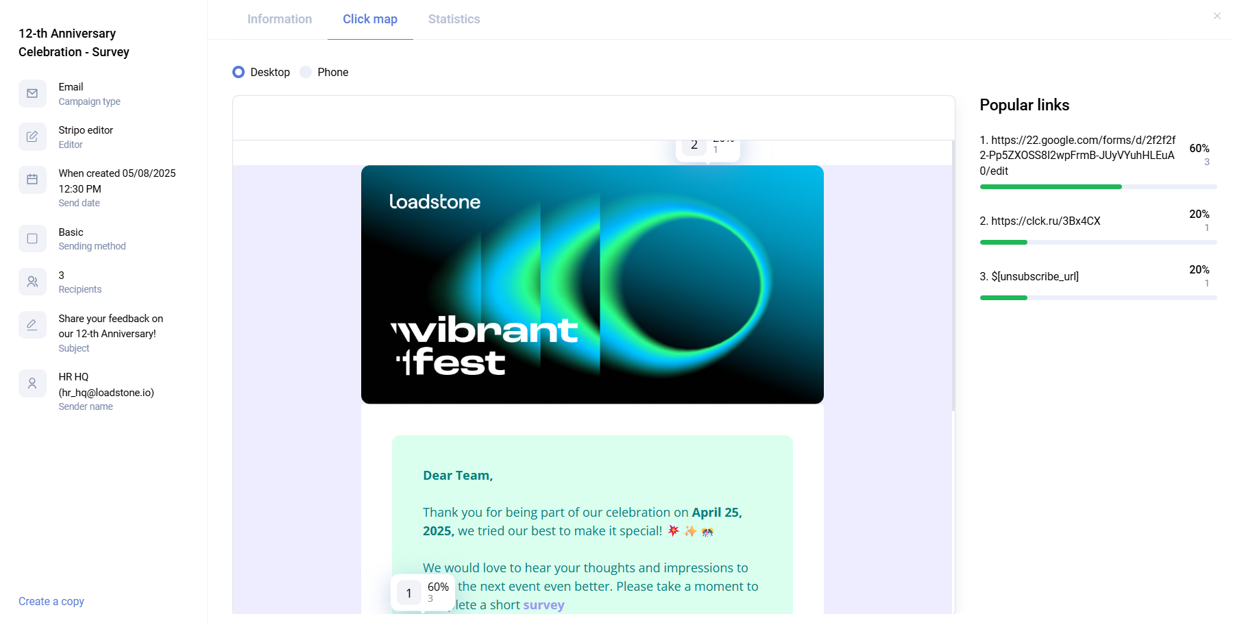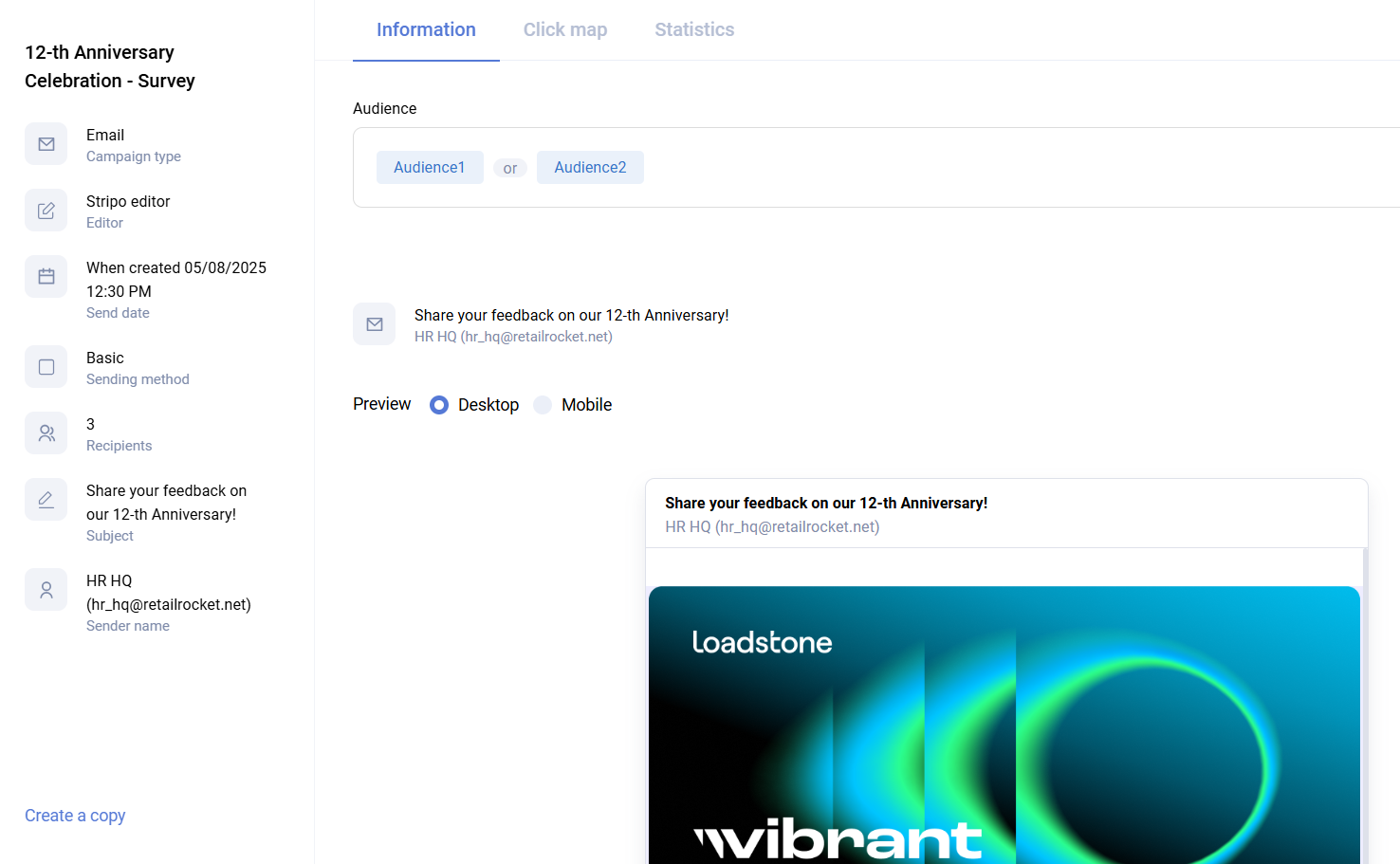 - Mailing preview showing how it will look on desktop and mobile. If variables are used in the mailing, they appear the same way as in the editor.