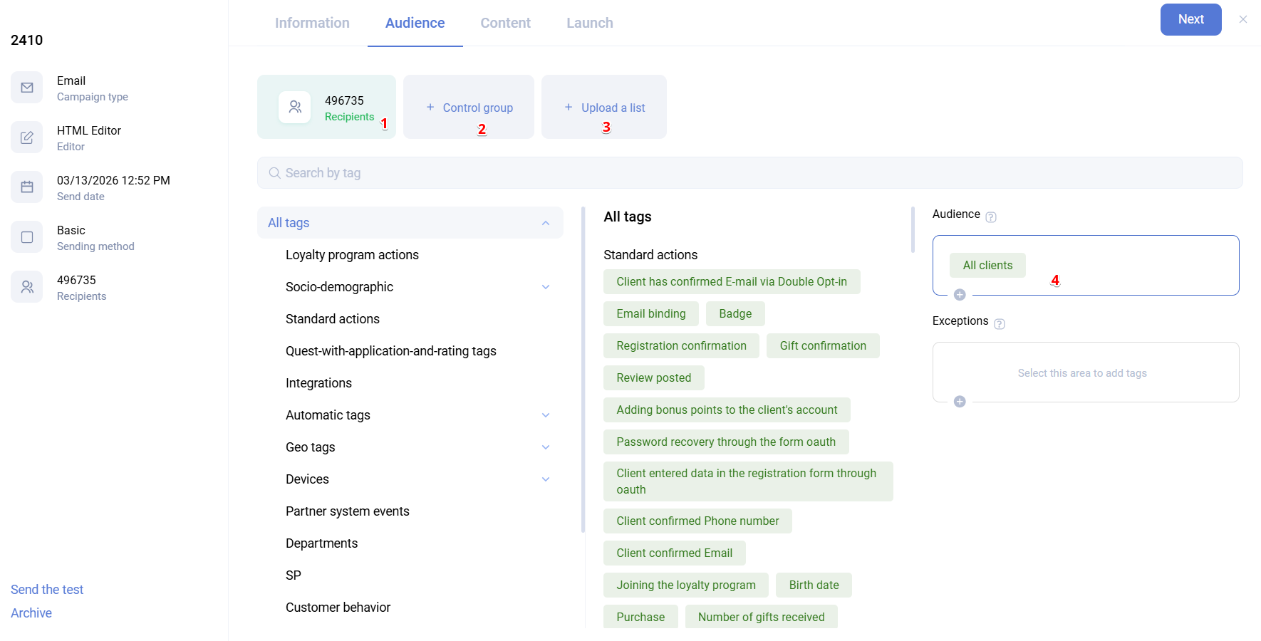 - Control group - a segment of the audience that matches the selected conditions but does not receive the mailing. This group is used to measure the actual impact of the communication and determine whether sales were really caused by the mailing or happened independently. Members of this group receive the corresponding tag after the mailing.