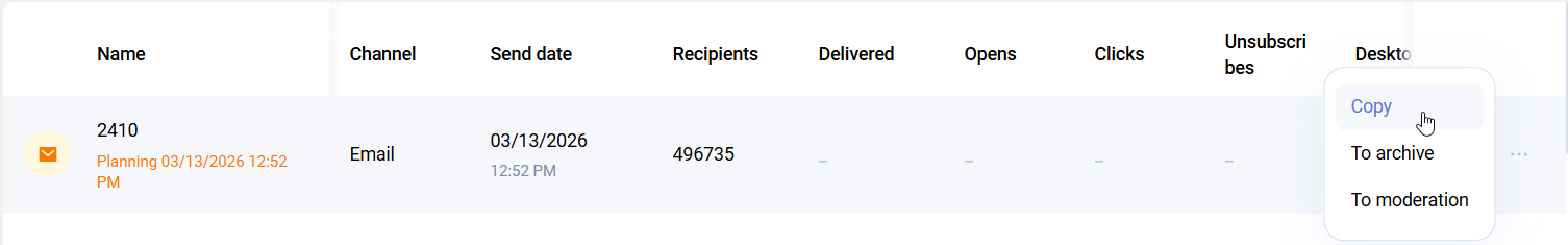 Planned + date/timeorSend immediately after moderation. - Scheduled - the mailing cannot be edited, but it can be archived or sent for moderation. In the list, the card shows