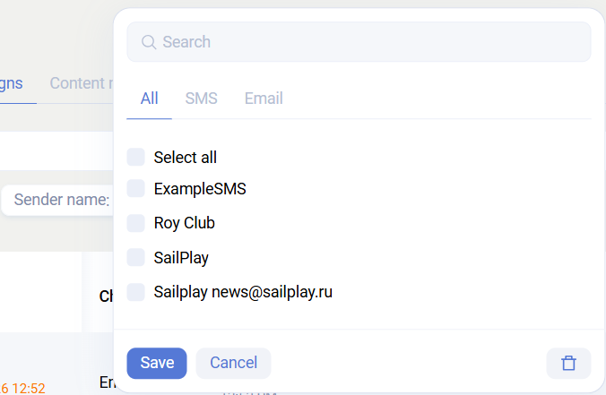 Sender - filters by sender name. A partner can have several sender names, both across different mailing types and within a single type.