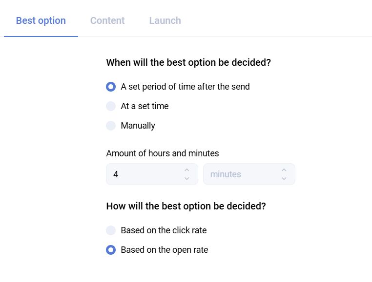 Manually, in which case the main send is not started automatically. - How the best variant is determined - the method used to evaluate performance: by number of opens or by number of clicks.
