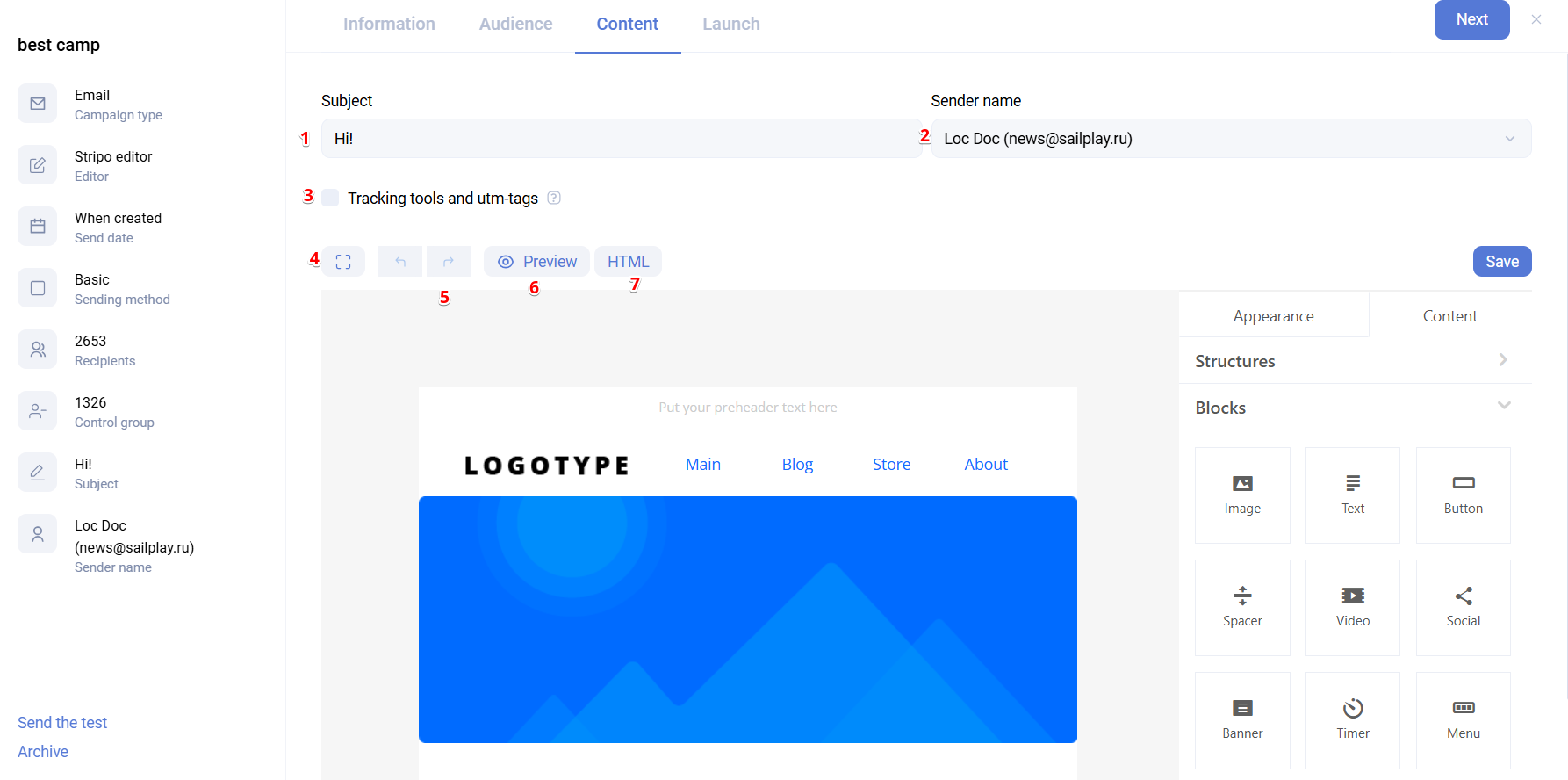 - HTML editing. In this example, the Stripo editor is used. It allows ready-made blocks, but for more custom templates you can switch to the Stripo HTML editor and continue editing there.
