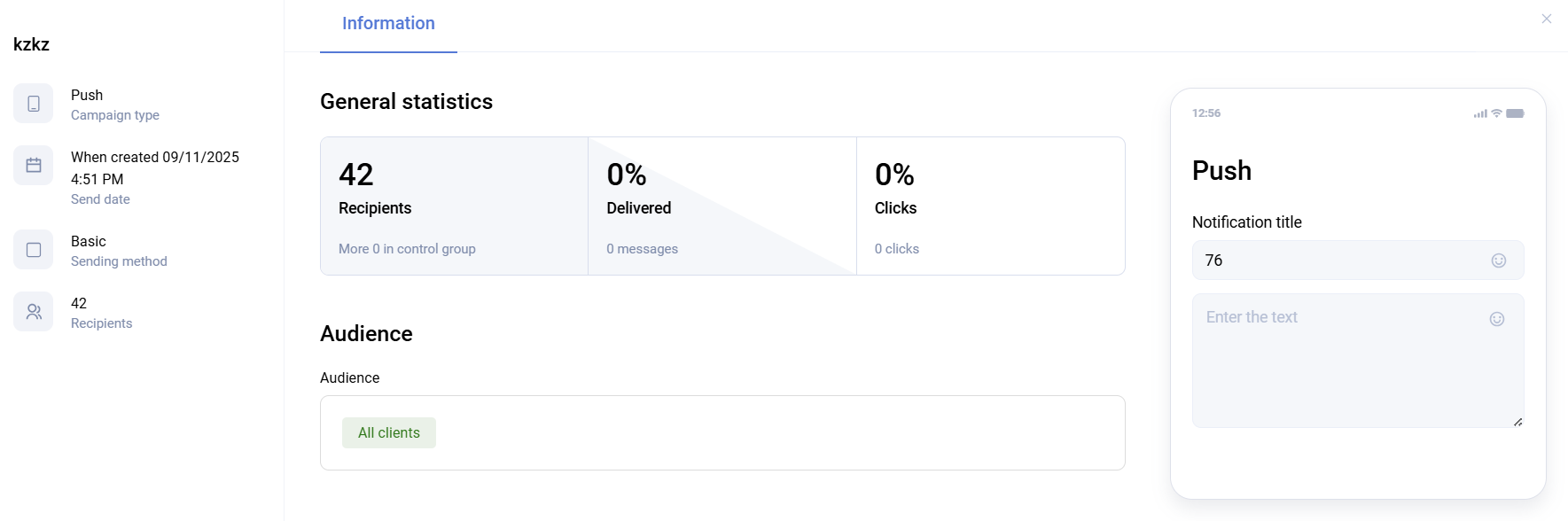 For SMS and Push mailings, this is the only analytics section, and in addition to the basic information it also contains the overall mailing statistics.