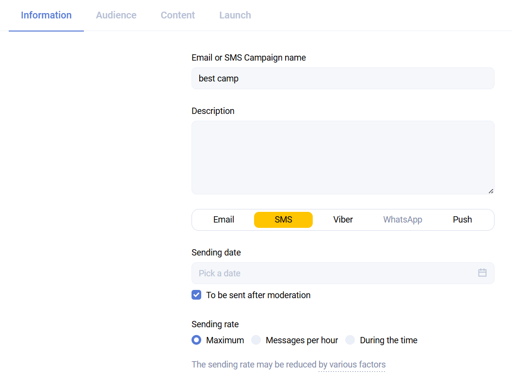 Send date - by default, sending starts immediately after creation. If you clear the checkbox, you can specify an exact send time.