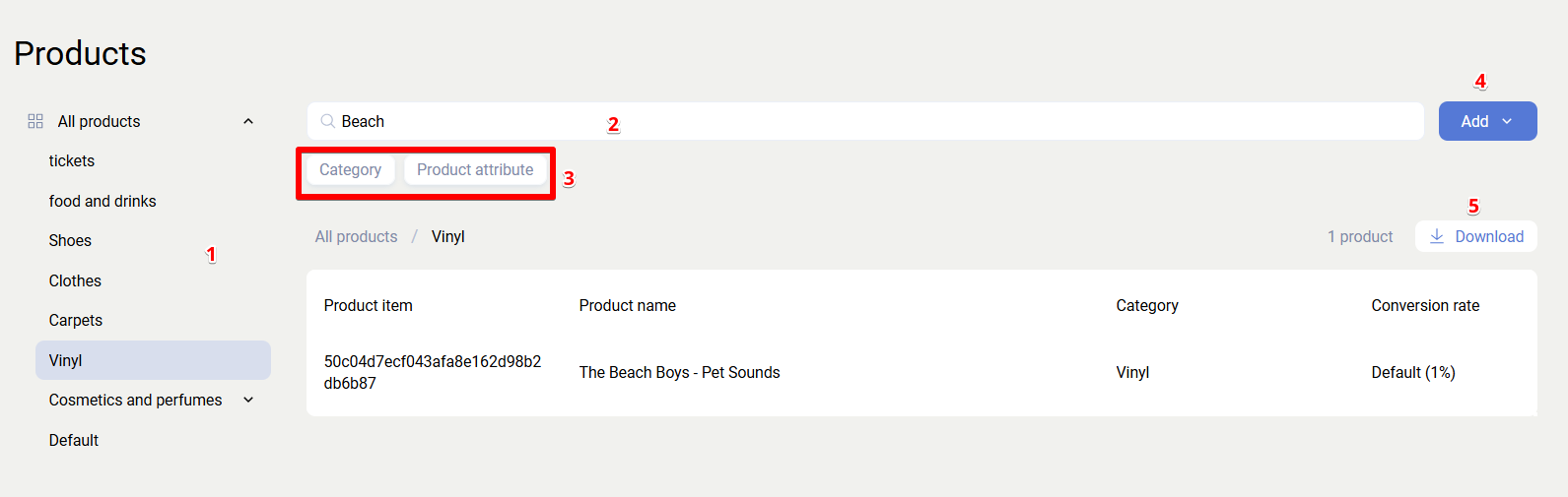 Numeric values can be used in range-based filters. String values support exact matching only. Purchases have a separate entity called a position attribute. Do not confuse it with a product attribute.