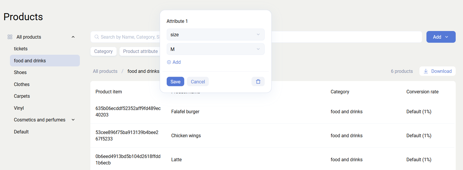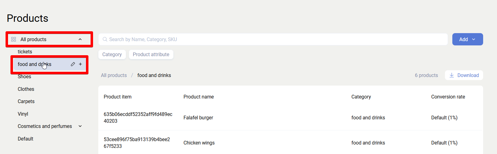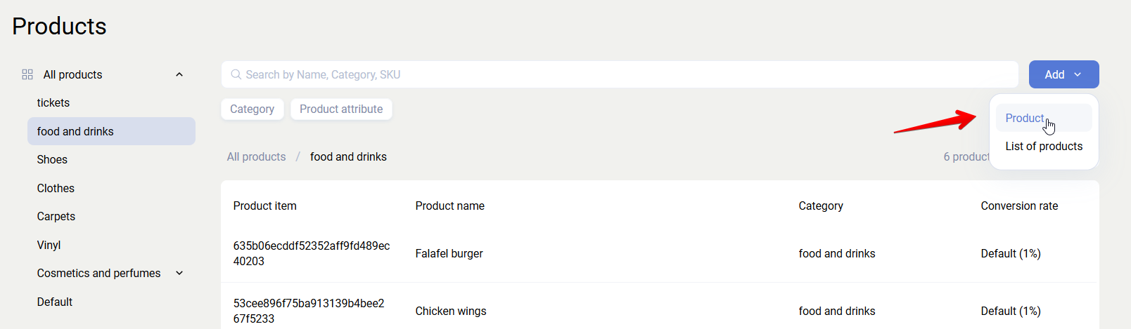 The Products section allows you to create and edit products, product categories, and product attributes.