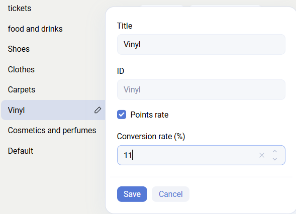 - Default coefficient: configured in the general settings (Settings -> Bonus Points -> Rubles to points conversion).