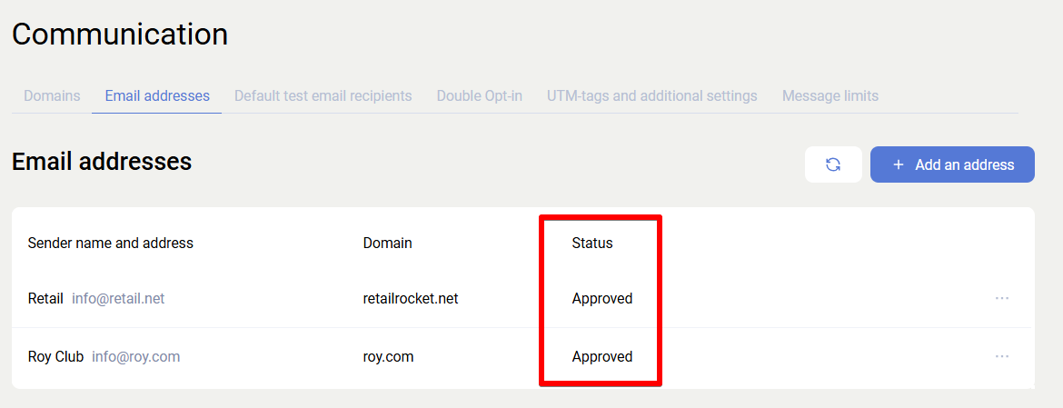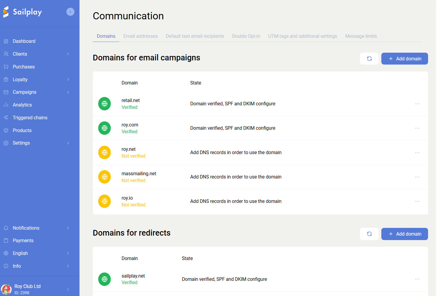 This is the list of verified domains from which Email mailings are allowed to be sent. A domain is added in the dashboard and then must pass administrator moderation.