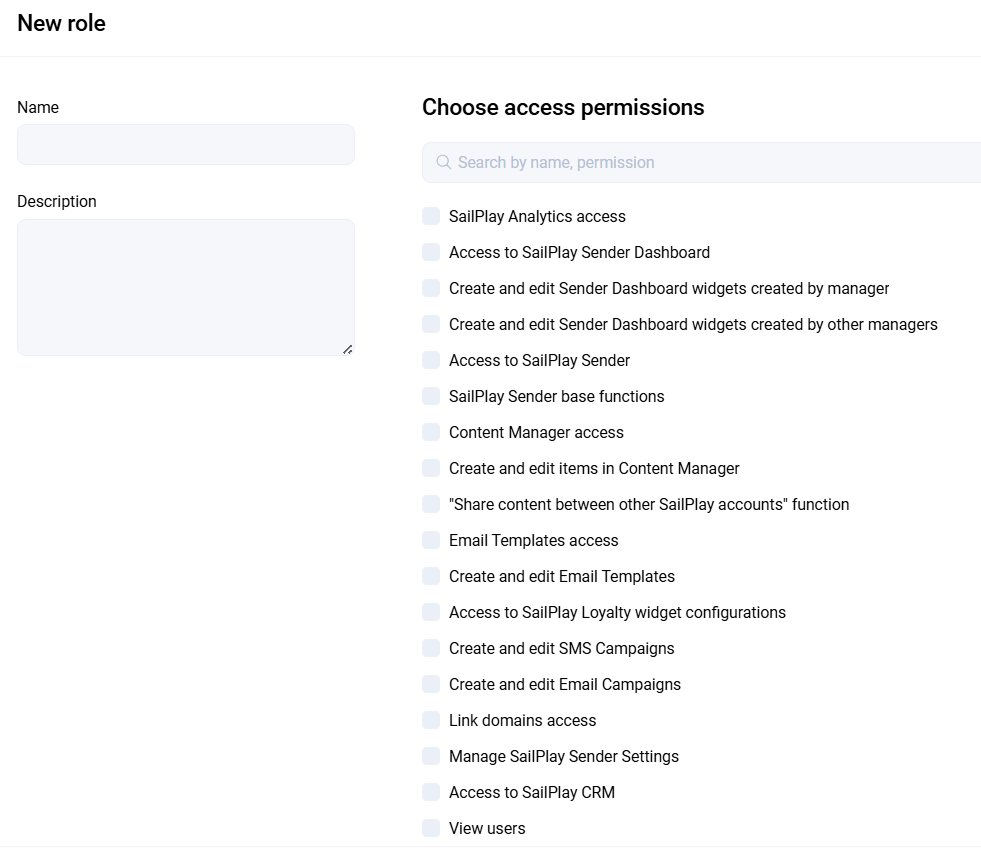 When creating a role, specify its name and description, then select the required permissions such as view, edit, and others.