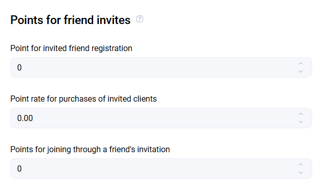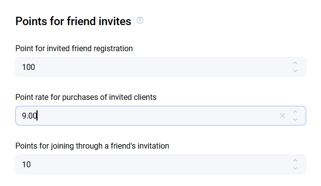 - Point coefficient for invited friends' purchases - the percentage of points the referrer receives from their friend's purchases.