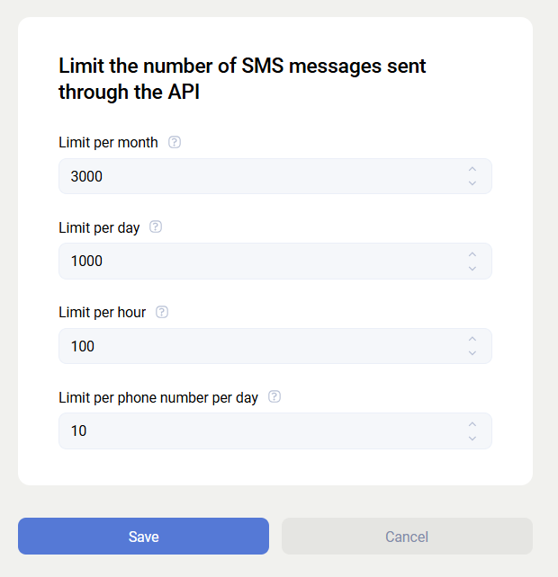 This subsection configures limits for sending SMS via the API to avoid excessive costs or spam.