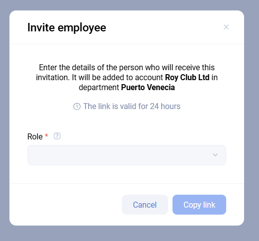 - Invite - generates an invitation link with a selected role. The link is valid for 24 hours
