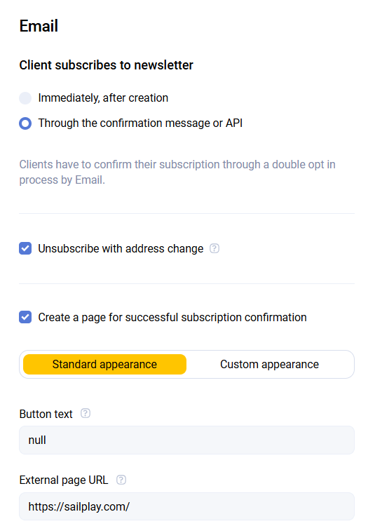 Email changedtag is assigned so DOI can be requested again - Confirmation page - configures the page a user sees after clicking the link in the email, either the standard page or custom HTML