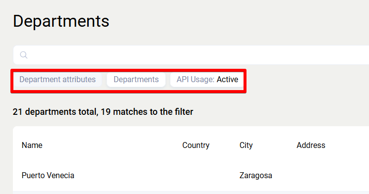 Departments can be filtered by attributes, subdivisions, or API activity.