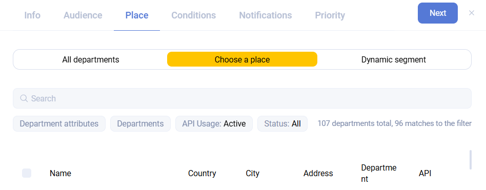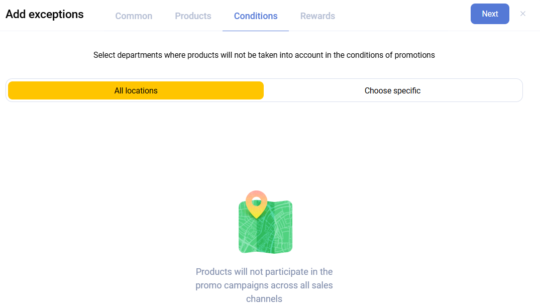 This step defines the points of sale where the promotion applies. By default, All points of sale are selected. Sailplay supports any number of departments.