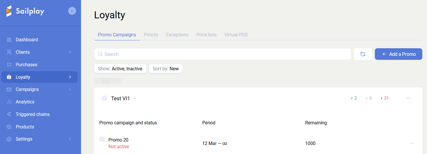 For convenience, promotions are grouped into campaigns. Sailplay allows you to create an unlimited number of campaigns and promotions. To add a new promotion, you must first create a campaign. Promotion management, including creation, editing, archiving, and moving promotions between campaigns, is handled through the dashboard interface.