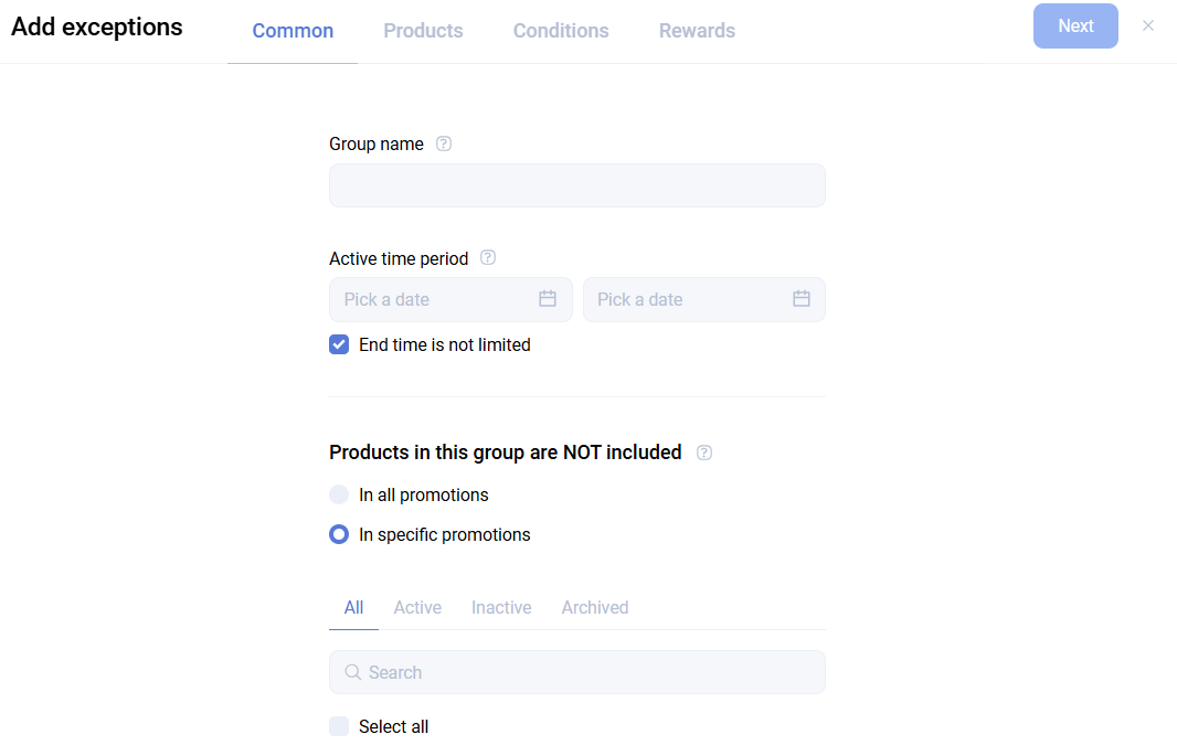 At the third step, configure exclusions for promotion conditions. This supports mechanics such as do not count alcohol toward the conditions of selected promotions. For example, a promotion gives a 10% discount for orders above 10,000 rubles. The order total is 12,000, but alcohol accounts for 11,950, so the discount will not be applied.