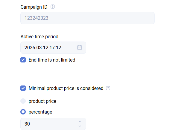 - Promotion period - the activity period of the promotion. The end date can be omitted by enabling