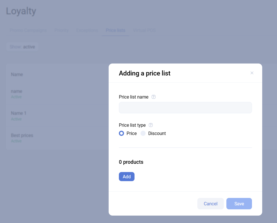 This subsection allows you to add price lists with fixed values for a specific set of products. The created price list can then be used in a Price list reward.