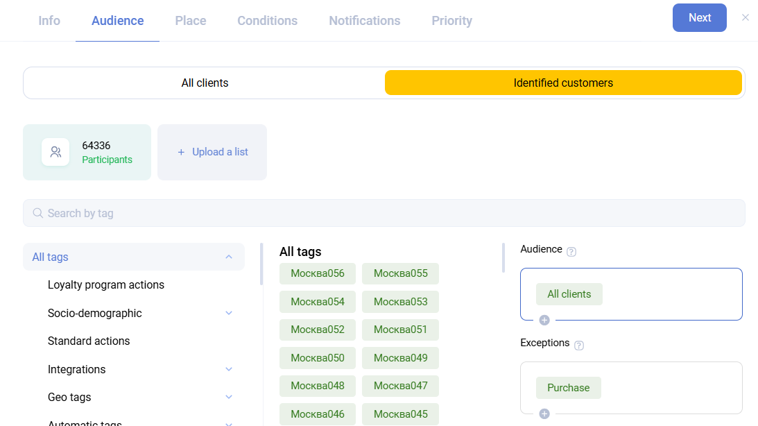 Tags can be used to narrow the audience precisely. For example, you can include clients who filled in their profile and exclude those who unsubscribed from email.
