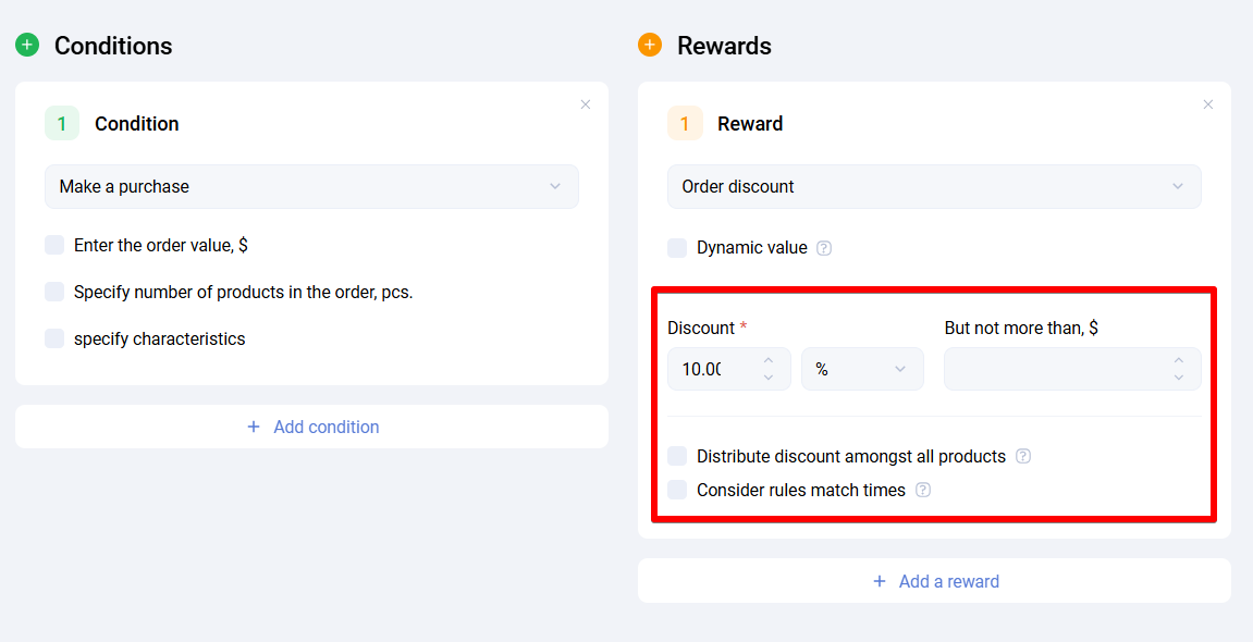 - Maximum reward amount per promotion - sets the maximum discount amount that can be granted to a single client within this promotion. After the limit is reached, rewards stop being accrued. It is calculated as the difference between the original product price (