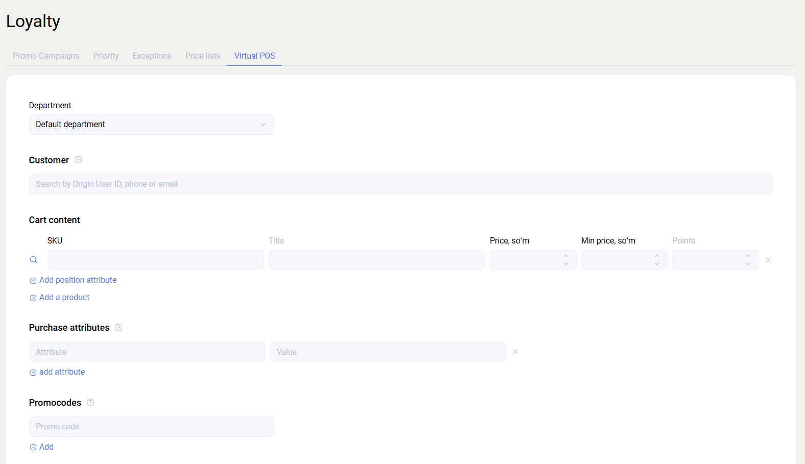 The Loyalty section is used to create and configure promotions with different discount mechanics, such as bonus points, discounts for reaching a required amount, discounts for purchasing specific products, promocodes, and other reward logic.