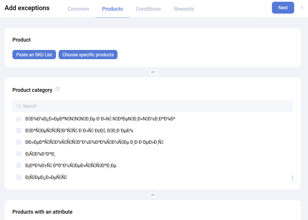 At the second step, define the products covered by the exclusion. Products can be selected: